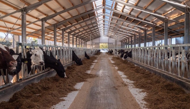 Het indrukwekkende melkgebouw van de familie Géron. Bij mooi weer is de roldeur geopend, zodat je vanaf het erf een blik kan werpen op de Saturnus binnenmelker van Fullwood Packo.